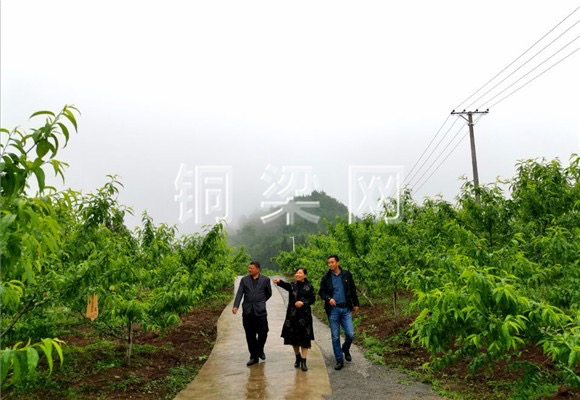 4月22日上午,細(xì)雨紛紛。在水口鎮(zhèn)樹蔭村12、13社的山坡上,鎮(zhèn)領(lǐng)導(dǎo)陳瓊、村支書趙安福和重慶機(jī)場(chǎng)集團(tuán)派駐樹蔭村的第一書記趙先平正在冒雨察看桃樹結(jié)果情況。